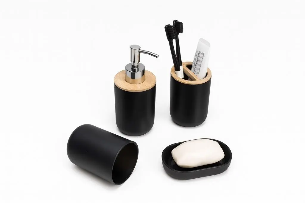 Dale a tu baño el toque sofisticado que merece con este Set de baño moderno de cuatro piezas en negro con detalles en madera. ¡Convertí tu rutina diaria en una experiencia más agradable y organizada!